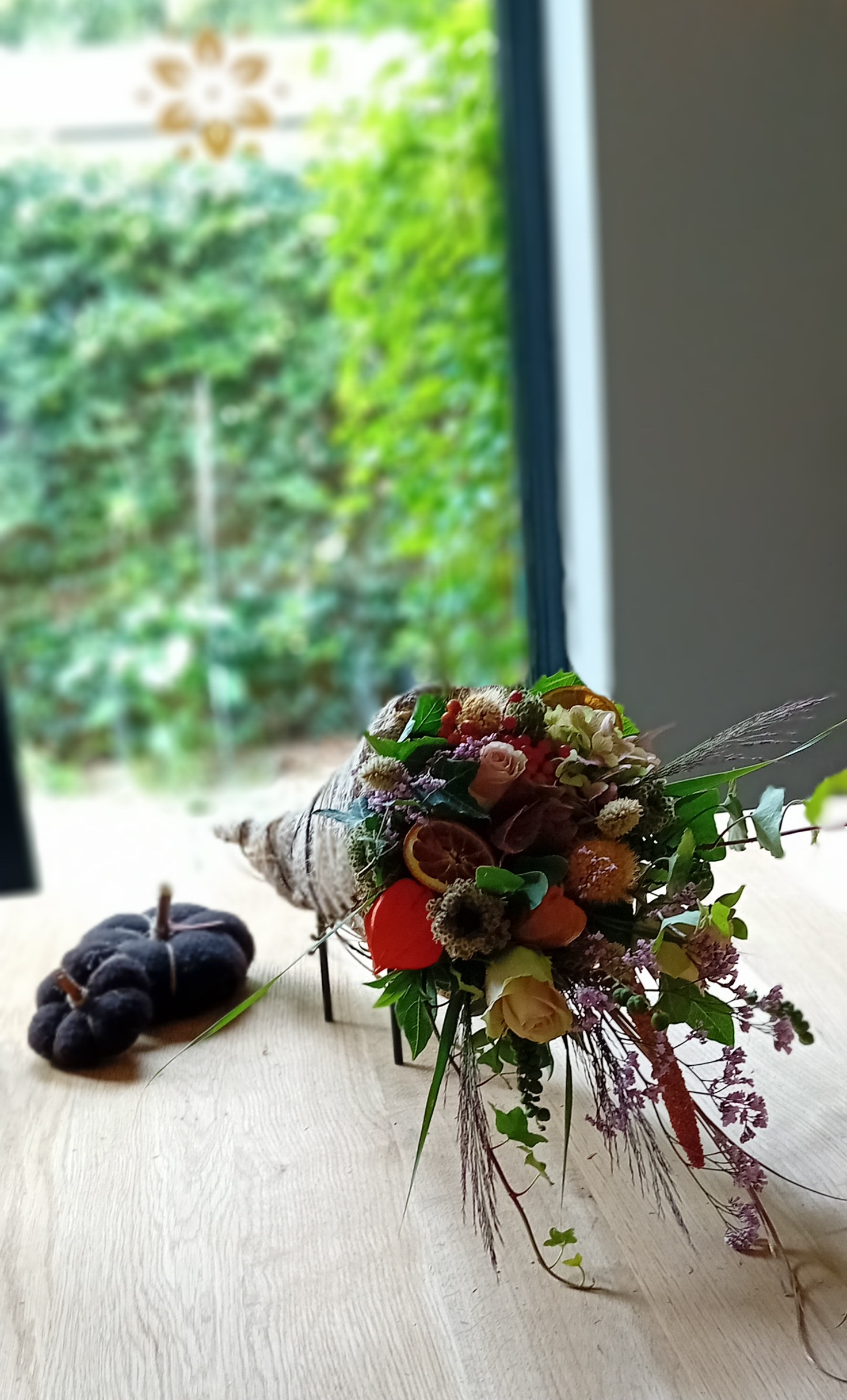 Lekker creatief aan de slag met het maken van de hoorn (60cm) op standaard en deze dan opmaken met allerlei mooie herfstmaterialen, verse snijbloemen, droogmaterialen en diverse soorten groen.