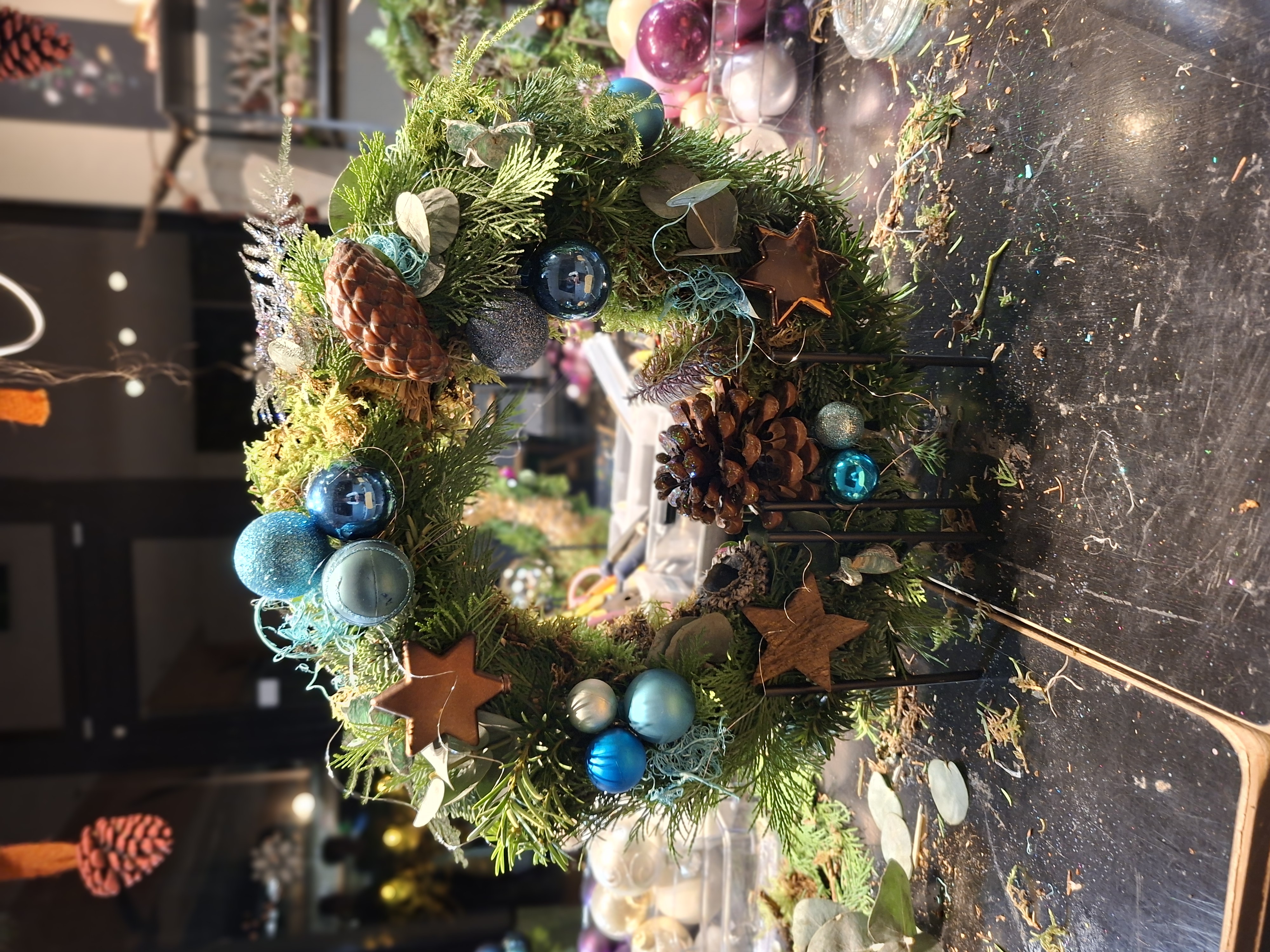 Tijdens de workshop ga je deze open krans( 35cm, h. 20 cm ) zelf binden met groen. Keuze uit diverse kleuren en materialen die bij je passen. Zoals dennenappels, kerstballen, sterretjes en leuke kerstmaterialen. Deze workshop is inclusief de standaard.