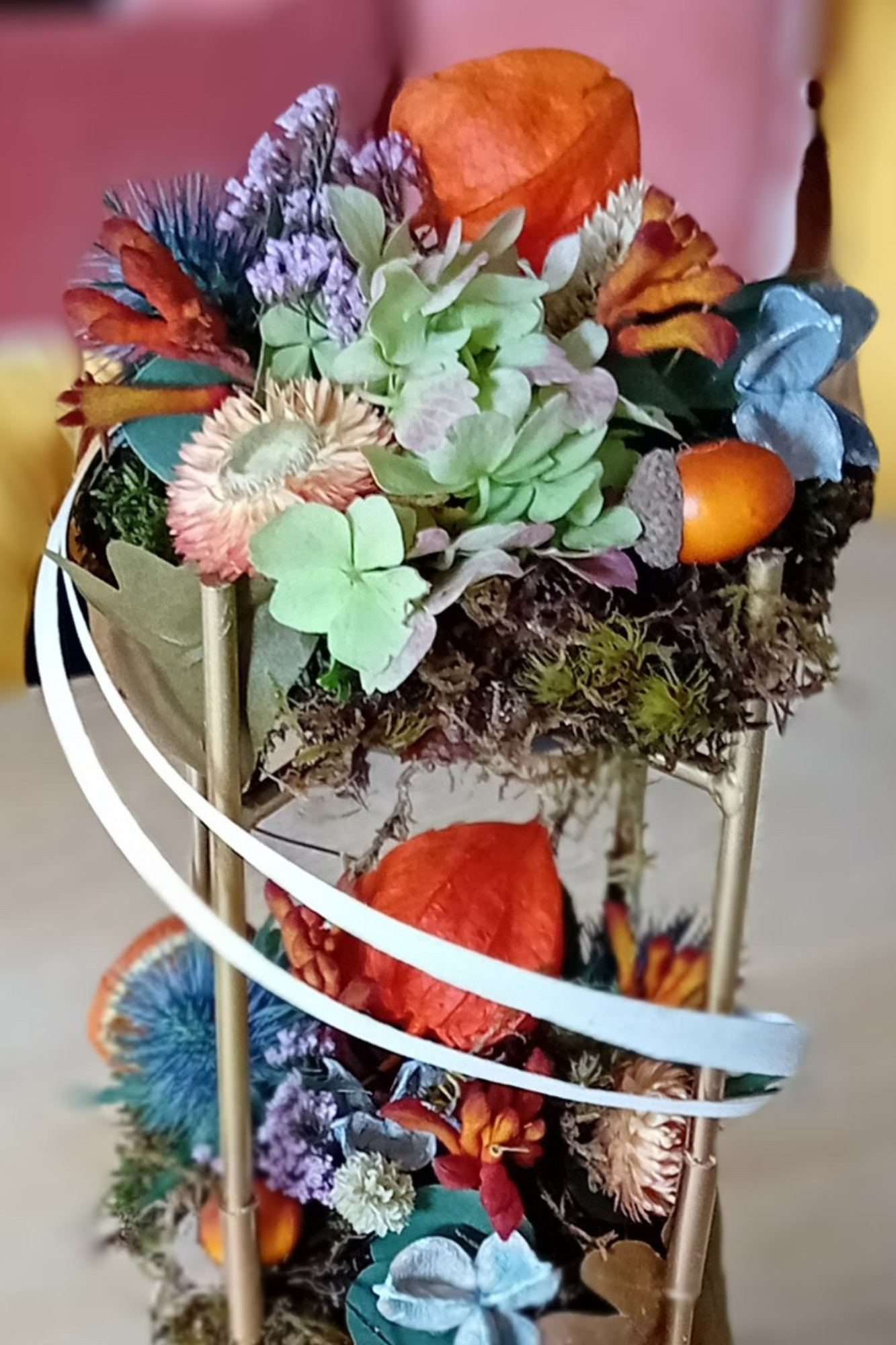 Je kunt ook kiezen voor het maken van een mooie herfst etagère (50 cm hoog) opmaken met o.a. distels, mos, hortensia, limonium, eikeltjes en leuke droog en herfst materialen die mooi indrogen