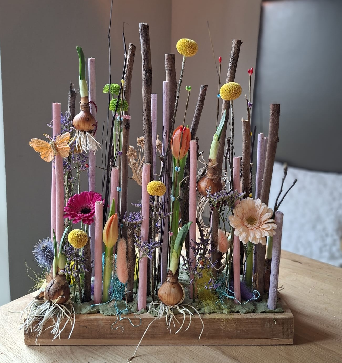 Met allerlei rechte takken lineair gestoken in een houten schaal met steekschuim deze is afgewerkt met klei en tussen de takken binden we dan diverse voorjaarsmaterialen met o.a. eitjes, vlinders, veertjes en bloembolletjes, de verse snijbloemen doen we in buisjes zodat deze gemakkelijk te vervangen zijn en dat je dus lang plezier hebt van je voorjaarsstuk.