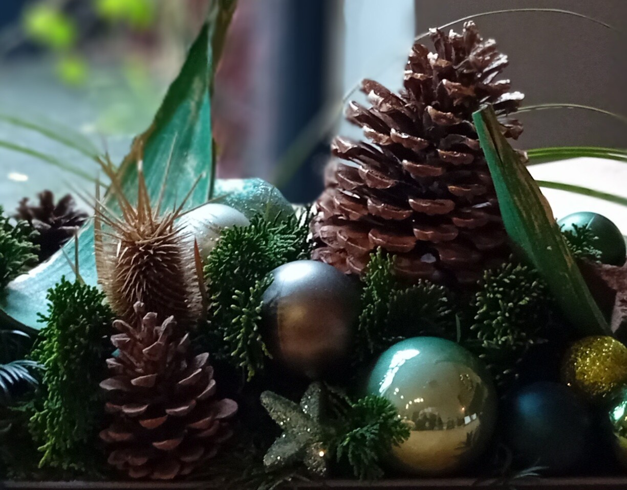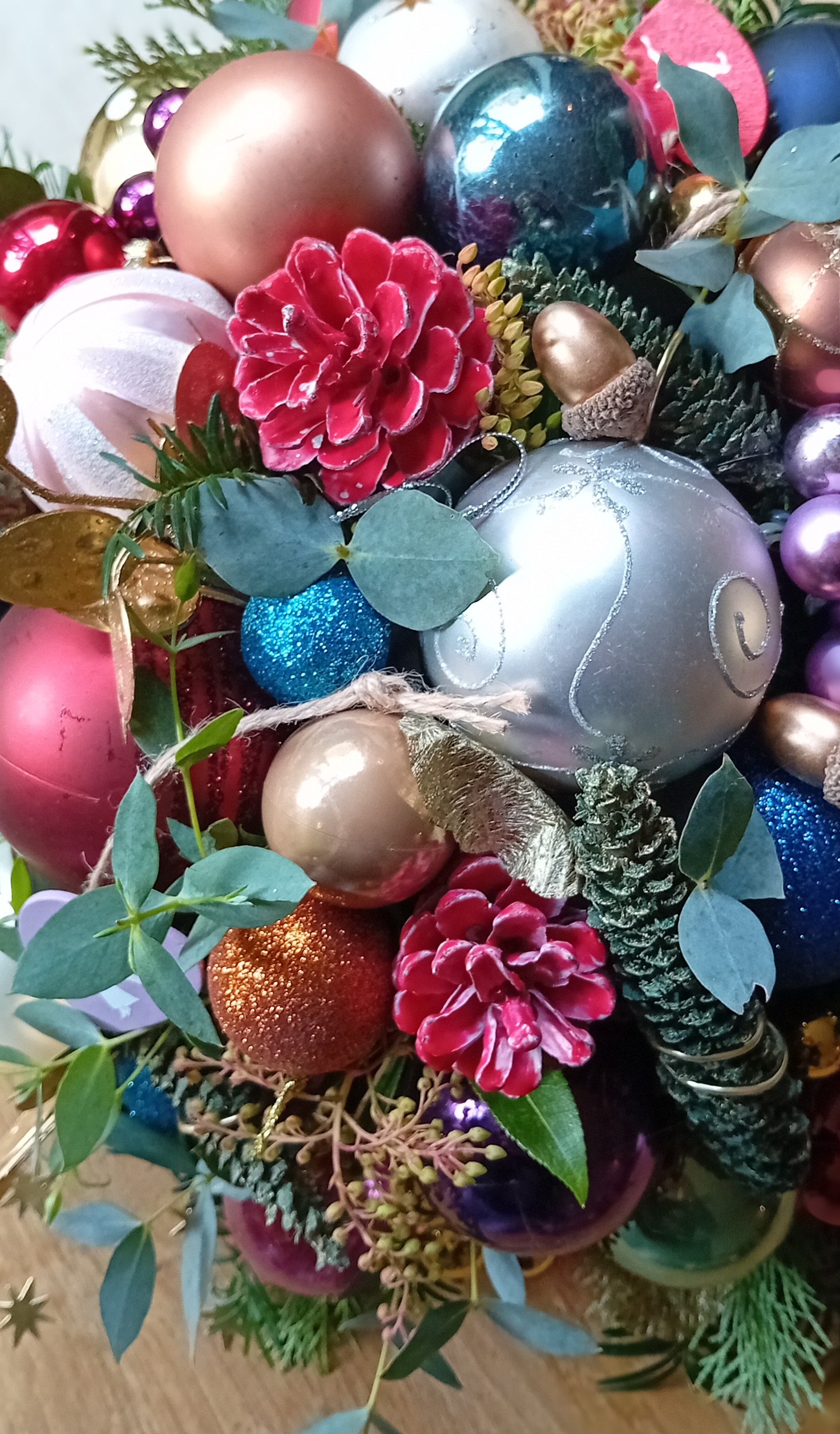 Mooie biedermeier in schaal (35cm/ h. 20cm )met verschillende soorten kerstgroen, div. kerstmaterialen en vooral heel veel soorten kerstballen. Wil je deze niet met bonte kleuren. Deze is ook te maken in een kleur die bij je interieur past.