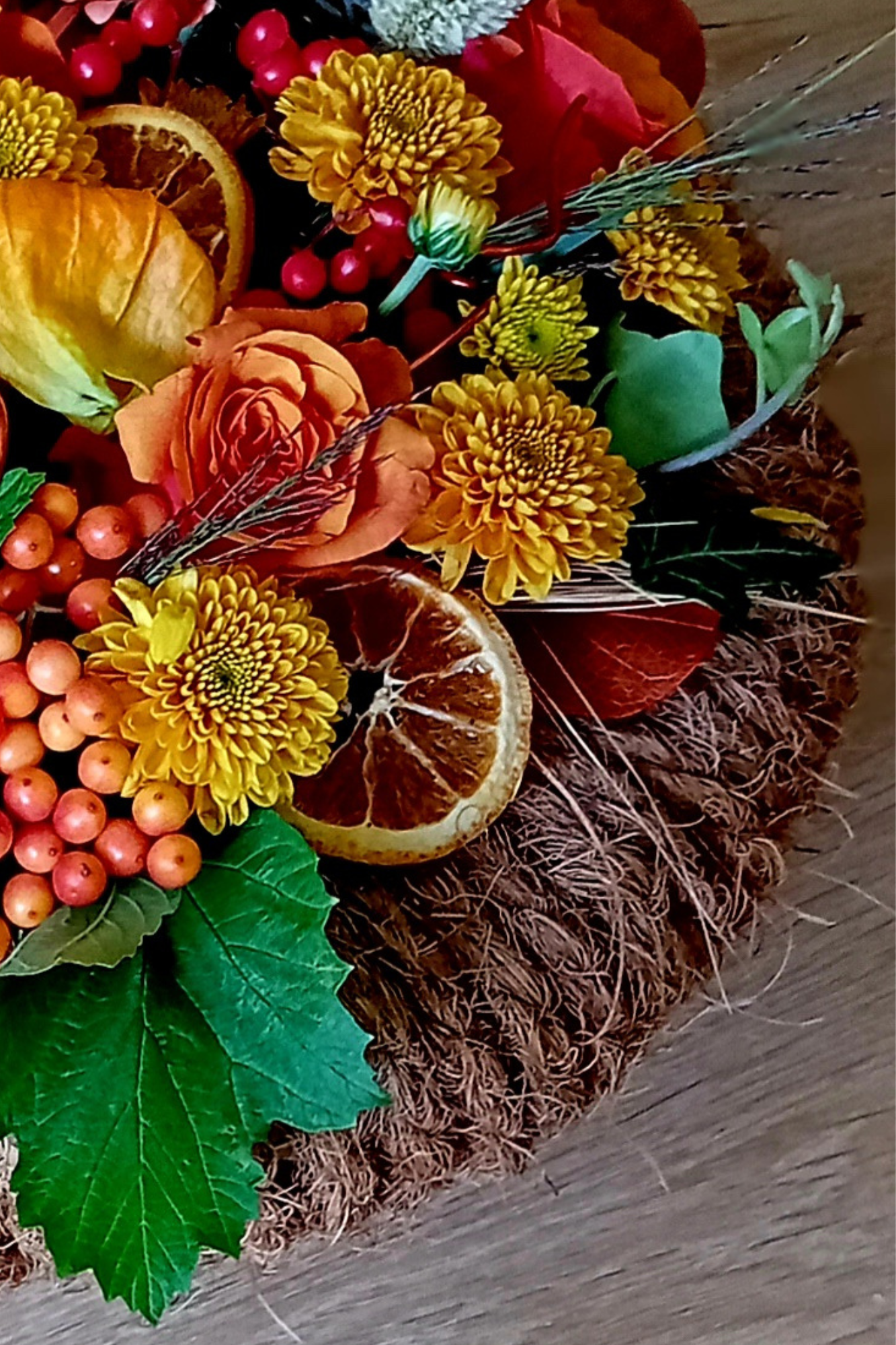Tijdens de workshop ga je zelf een stoere krans maken van dik, natuurlijk touw, doorsnede 35 cm. Daarna ga je hem opmaken met mooie verse snijbloemen, pompoentjes, leuke herfstmaterialen, diverse soorten groen en er is genoeg keuze uit verschillende blijvende er verse materialen. Zo neem je een uniek herfststuk mee naar huis!