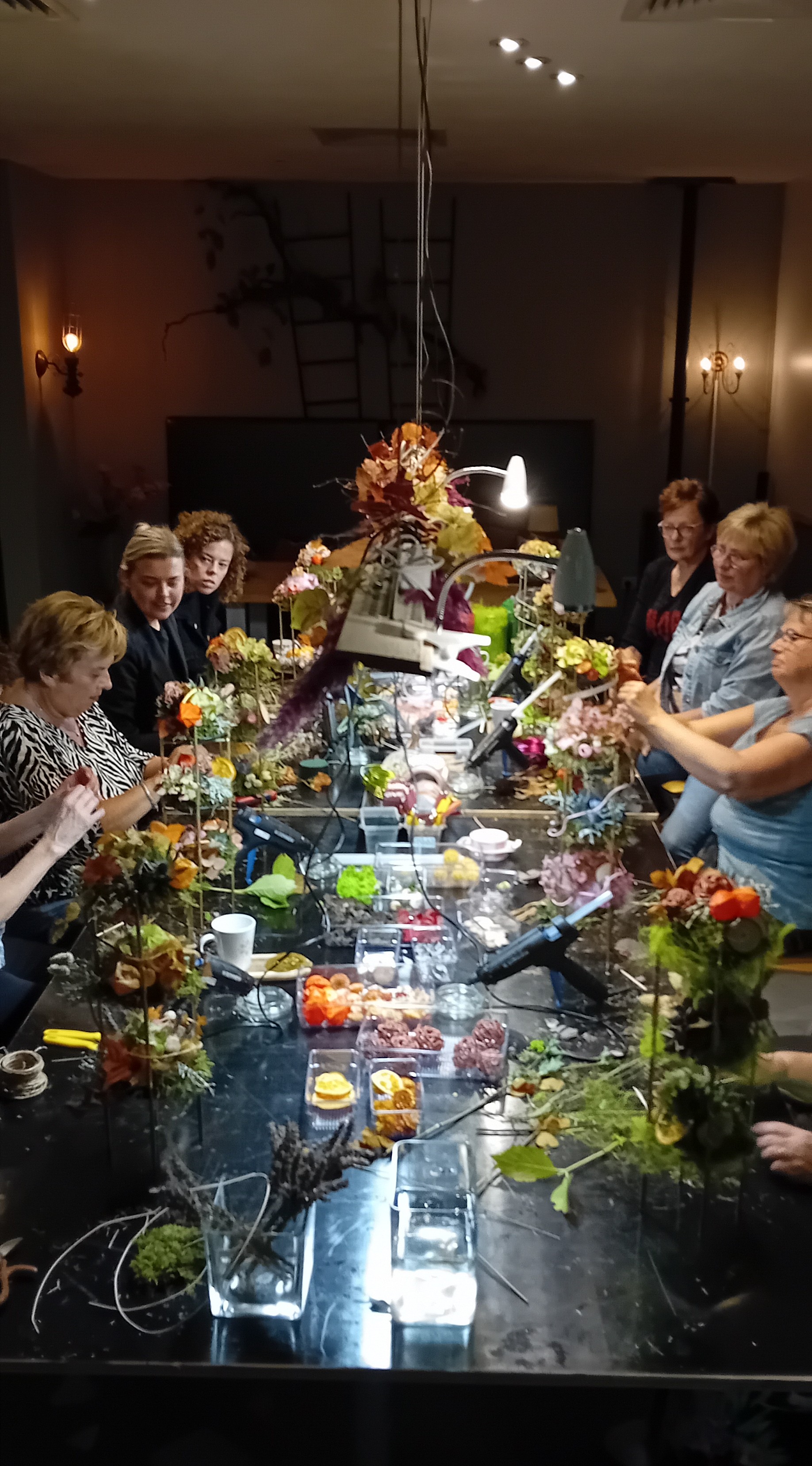 Het was een creatieve, gezellige avond en al de cursisten hadden een mooi voorjaarsbloemstuk gemaakt